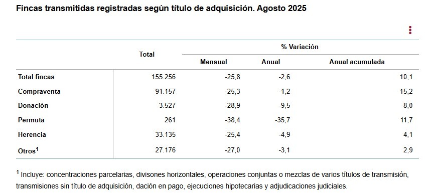 El número de fincas transmitidas inscritas en los registros de la propiedad (procedentes de escrituras públicas realizadas anteriormente) en el mes de agosto fue de 155.256, lo que supuso un 2,6% menos que en el mismo mes de 2024. Se prevé un fin del tercer trimestre con una ralentización en las compraventas.