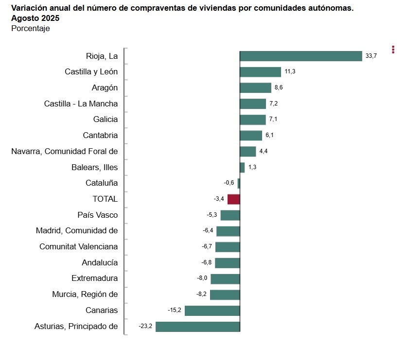 Atendiendo a las compraventas de viviendas registradas, las comunidades autónomas que presentaron los mayores aumentos fueron La Rioja (33,7%), Castilla y León (11,3%) y Aragón (8,6%).